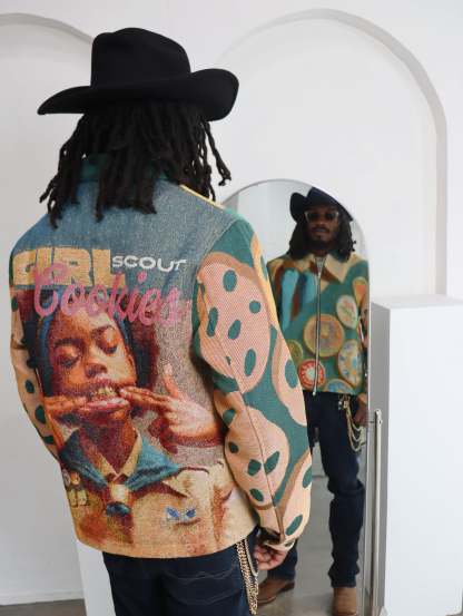 (MENS) GIRL SCOUT COOKIES HANDMADE TAPESTRY JACQUARD ZIPPERED JACKET